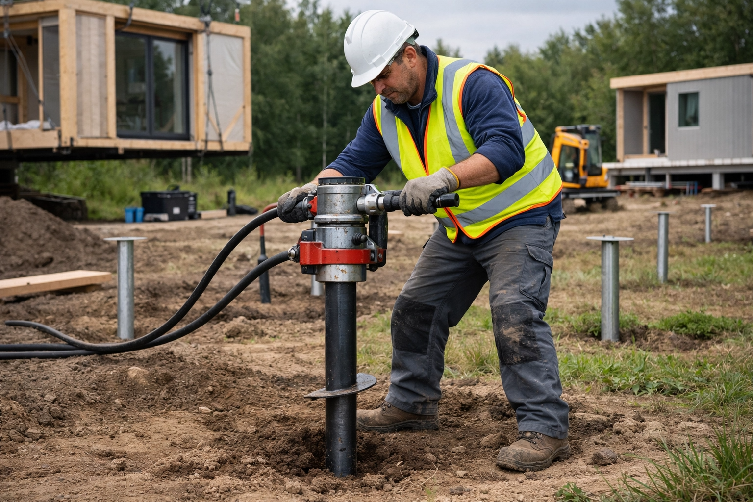 Параллельно с производством модулей устанавливается свайно-винтовой фундамент.